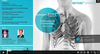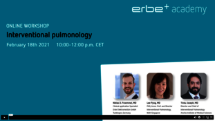 Webinar on demand105 mins.Recording from the Erbe Academy workshop at Wendisch Rietz on June 15, 2023. Learn more about: Erbe technologies in IP, multimodal applications in the central airway, diagnostic applications in the peripheral lung and emergent central airway conditions. It includes lectures from our recent Erbe Academy's course on Interventional Pulmonology held by Dr. Niklas Frömmel (Clinical Application Manager at Erbe), Prof. ssa Sara Tomassetti (University Hospital Florence), Prim. Priv.-Doz. Dr. Christopher Lambers (Ordensklinikum Linz). Whether you missed the course or want to rewatch presentations, the Workshop on demand is a convenient platform.